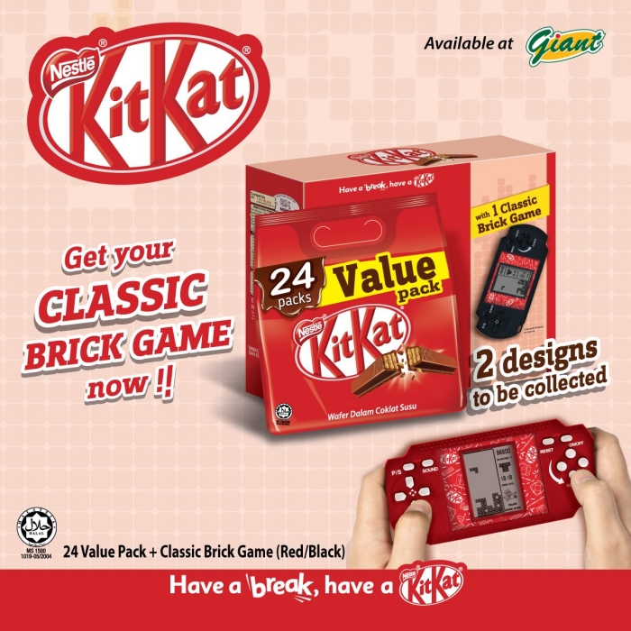 想要寻回儿时玩乐感觉的读者们,从即日起购买 KitKat 24 Value Pack ,就可以免费获取一个限量版的 Classic Brick Game 咯!可在 Giant 和 Aeon 中寻找得到产品的踪迹,售价为 RM24.90,里面除了游戏机外,当然还有多达 24 包的 KitKat 巧克力咯!