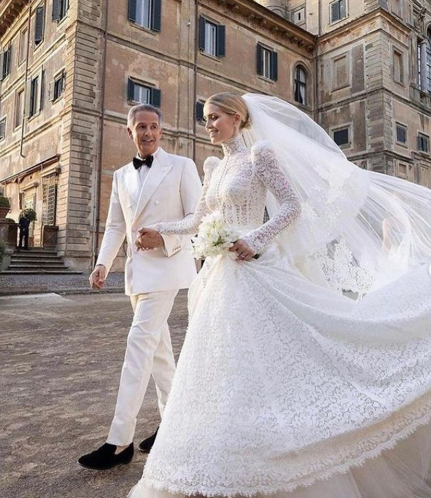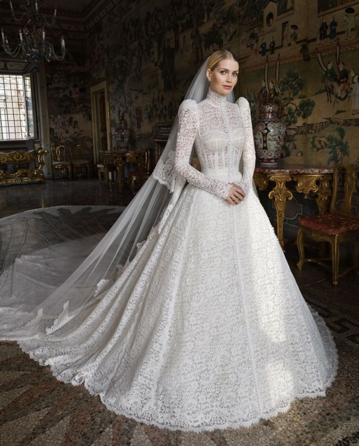 Kitty Spencer和Michael Lewis的婚礼选在了意大利罗马的Villa Aldobrandini庄园举行,大家最关注的当然是新娘的婚纱设计!新娘选择了来自意大利品牌Dolce & Gabbana的Alta Moda高级订制系列,维多利亚风格的复古造型婚纱,有着立体的公主袖和大面积的精致蕾丝,真的典雅又浪漫。