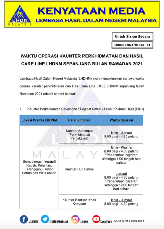 LHDN 柜台开放时间如下 ⬇️