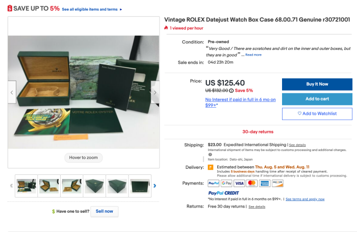 不知道你们买了名贵手袋和名表后,会不会都留着纸袋和盒子呢?如果还留着的话,搞不好你还能挖出来放上平台卖出去呢!不上ebay都不知道,原来这些名牌「空盒子」是那么有市场,像Rolex的表盒就至少可以卖到7-80美金!