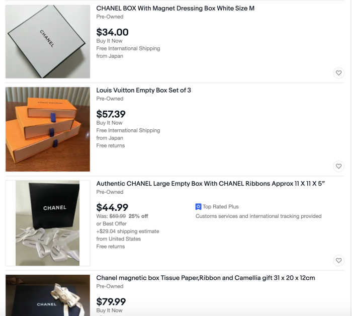 根据英国《星期日泰晤士报》的报道,他们注意到网络上不少人都在出售精品品牌的空盒和纸袋,而且售价并不是几十一百那么简单。小编也上了ebay输入关键字,像是Hermes和Chanel的空盒子,售价大概介于20-50美金之间,大概是RM50-RM200,这都要似乎尺寸大小和产品新旧,目前来看Rolex的空表盒售价最高,几乎在150美金之间,甚至更高。