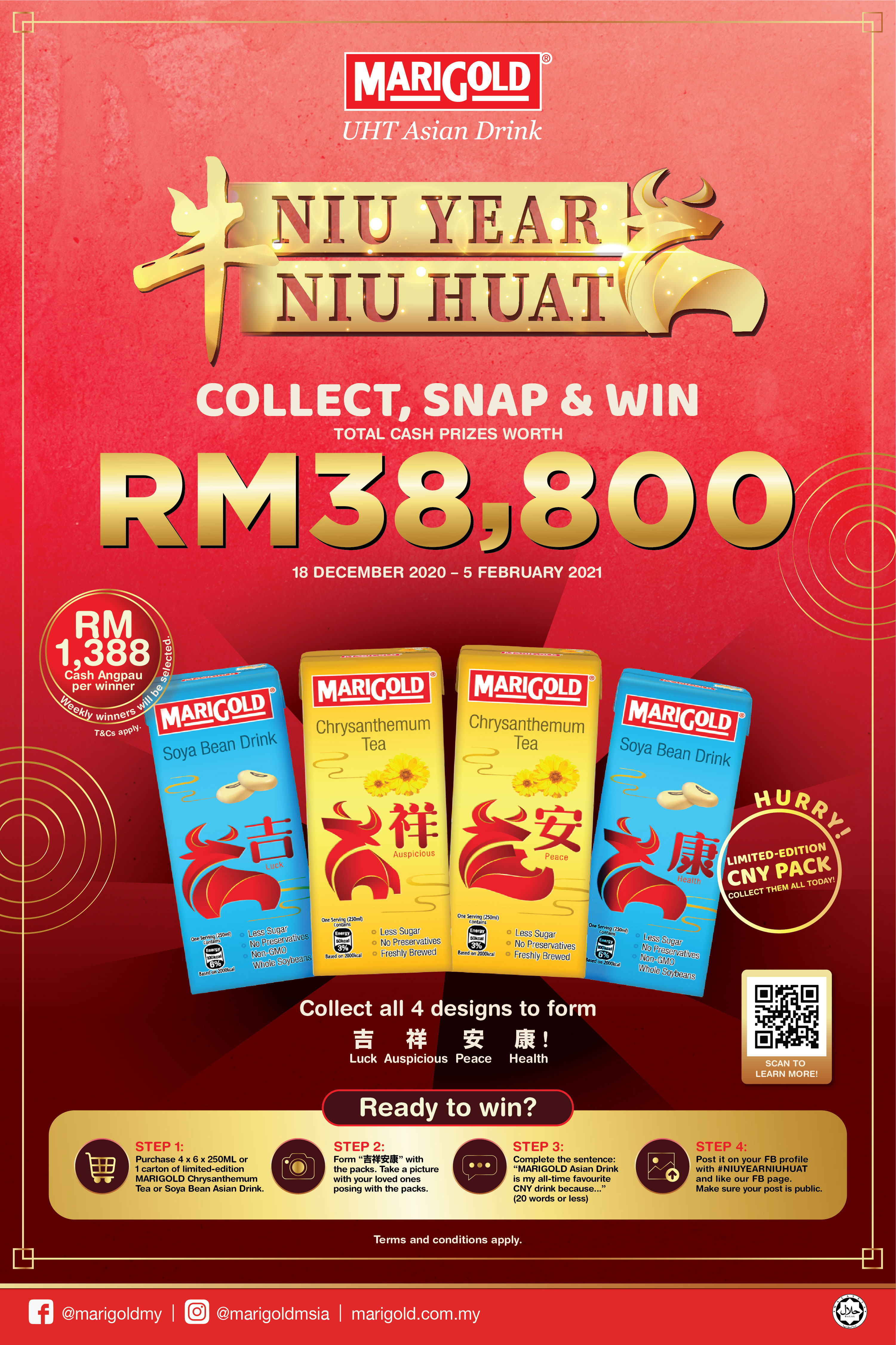 购买MARIGOLD限量版“吉祥安康”菊花茶和豆奶口味的亚洲饮品就有机会赢取大红包。我们将会把总值38800令吉的28份现金红包送给你,一起牛 YEAR, 牛 HUAT!