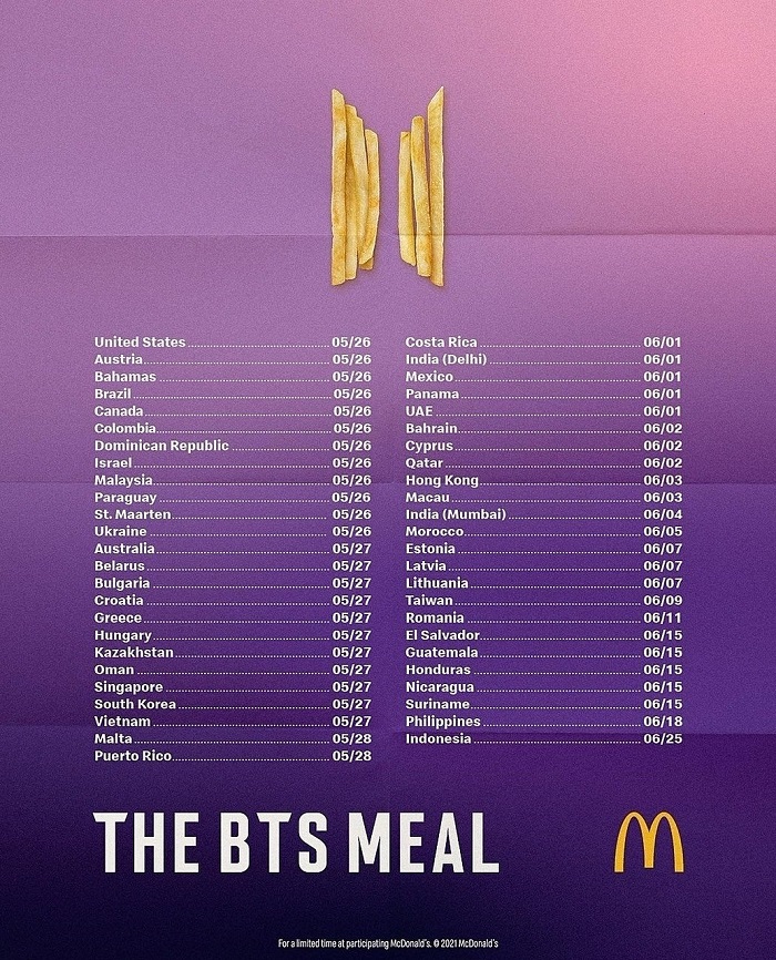 根据麦当劳公开一张国家发行日期图表,可以看到大马是首批跟美国同步上市这款联名套餐,日期于5月26日,粉丝们是不是有感幸福啊!!我们的“邻居”新加坡则是在上架隔天5月27日才能享用到BTS套餐呢!!