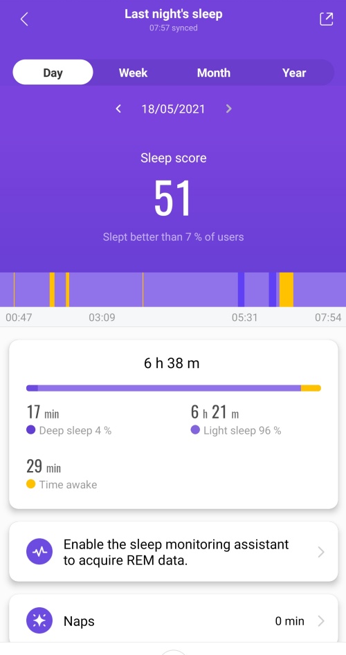 ✅ 戴着Mi Smart Band 6睡觉,可以检测到个人的睡眠质量。