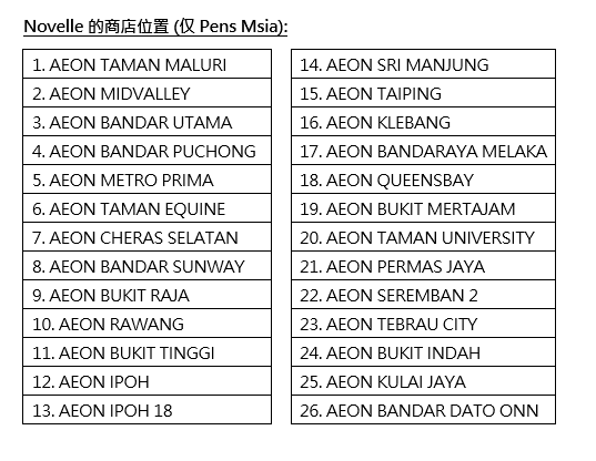 Novelle产品于2020年12月24日起发售在AEON购物广场(指定分行)