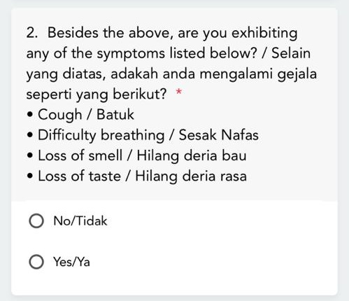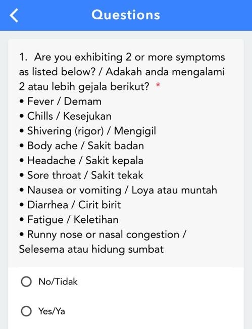 ⭕ 最近有没有发烧、发冷、发抖、全身酸痛、头痛、喉咙痛、呕吐、腹泻、疲劳、伤风。