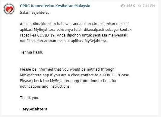 CPRC Kementerian Keshihatan Malaysia就提醒民众,必须经常留意自己的MySejahtera App,因为若根据记录,你和某个确诊病例有密切接触的话,将会收到相关通知。