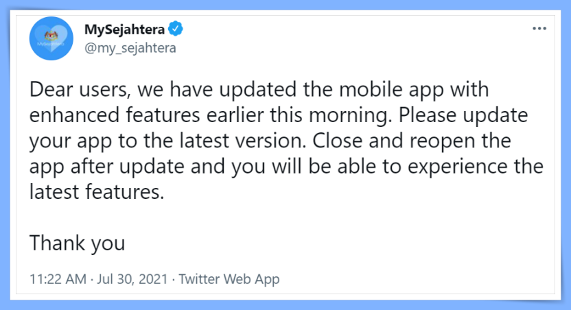 你已经更新了手机里的MySejahtera吗?MySejahtera今日在Twitter发文,目前已更新MySejahtera App,用户可以更新至最新版本,过后就可以使用新功能啦!
