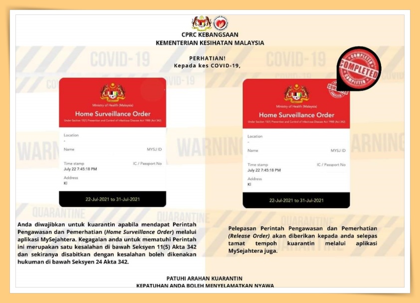 冠病确诊者按照指定期限内完成隔离后,MySejahtera的居家隔离令页面将会盖上“Completed”印章,这也表示获得释放令。+++++++++++++++++++++++++++++++++++