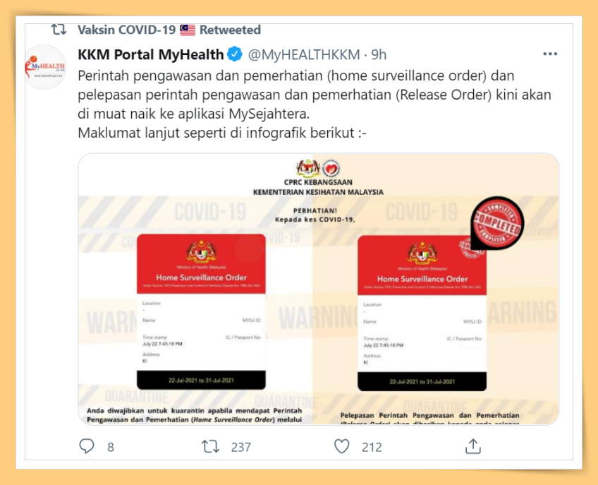 卫生部“MyHealth”平台发文指出,如果民众通过MySejahtera收到居家隔离令,就必须依照指令所显示的日期进行隔离。