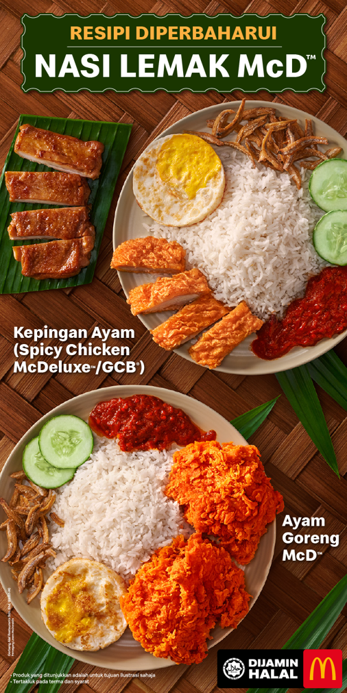 这道国民美食会搭配味道浓郁的班兰椰浆饭、酥脆的江鱼仔、新鲜的黄瓜、煎蛋及参巴辣椒酱,让人越吃越过瘾!而这道2.0改良版的Nasi Lemak也正式列入麦当劳菜单。从此以后,消费者在全马各地的麦当劳餐厅随时都能享用这道国民美食。