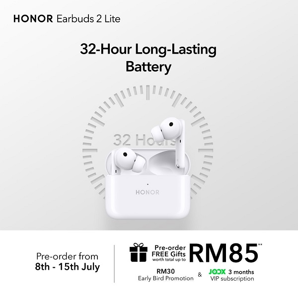 HONOR Earbuds 2 Lite 售价为RM299,从即日起至7月15日,凡到 Lazada HONOR 旗舰店、 Shopee HONOR官方商城、Senheng网店,以及全国HONOR 授权商店预购HONOR Earbuds 2 Lite,即可享有这项折扣RM30的早鸟优惠,还可获得总值RM85的赠品。优惠劵有限,先到先得!