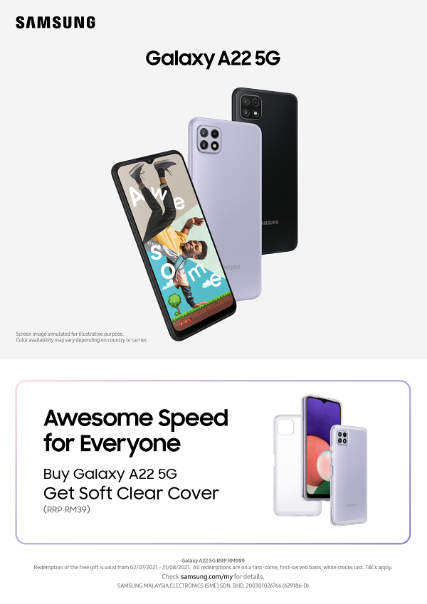 手机拥有3种配色-Gray,Mint和Violet,售价为RM999。即日起至8月31日期间购买Galaxy A22 5G,将免费一个价值RM39的透明手机壳,存货有限,先买先得,且需符合条规。