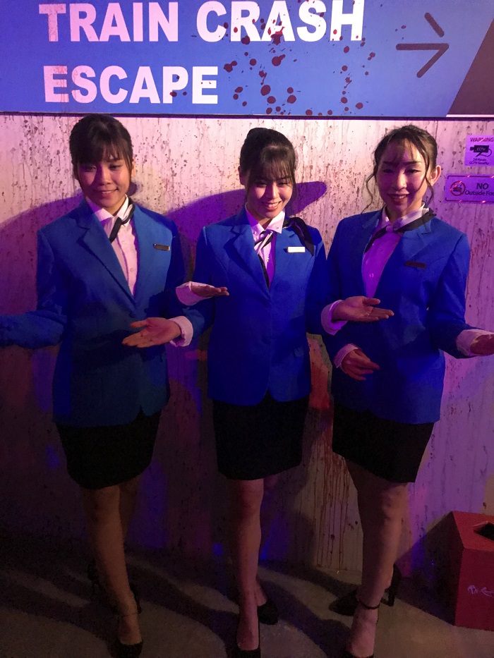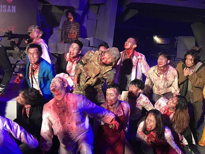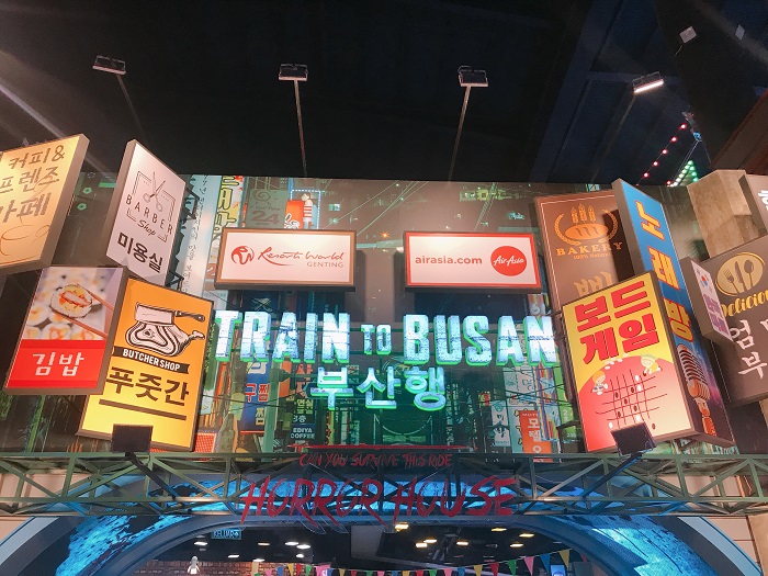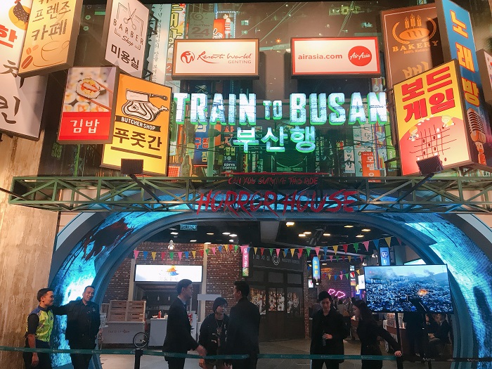 首先,《尸速列车》惊悚鬼屋入口处被打造成进入首尔一条繁忙的霓虹灯街道,这区甚至有些韩国街头小吃可以让大家购买。让大家吃饱饱之后才有力气逃亡,哈哈哈!!(大误)