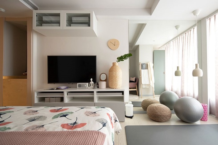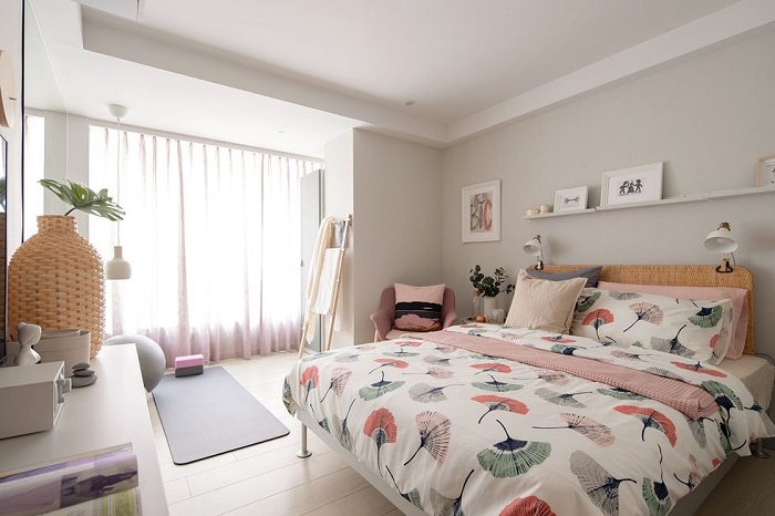 一定要有舒适的阳光洒落进房内,让空间多点光芒,採用柔和裸色系让人觉得心情愉悦,还有能放松伸展做瑜珈的角落。选用IKEA与英国设计师Tom Dixon合作设计的床组,可以依照需求加上边桌换上床头板,富有质感且独特优雅,享受生活从卧室开始。