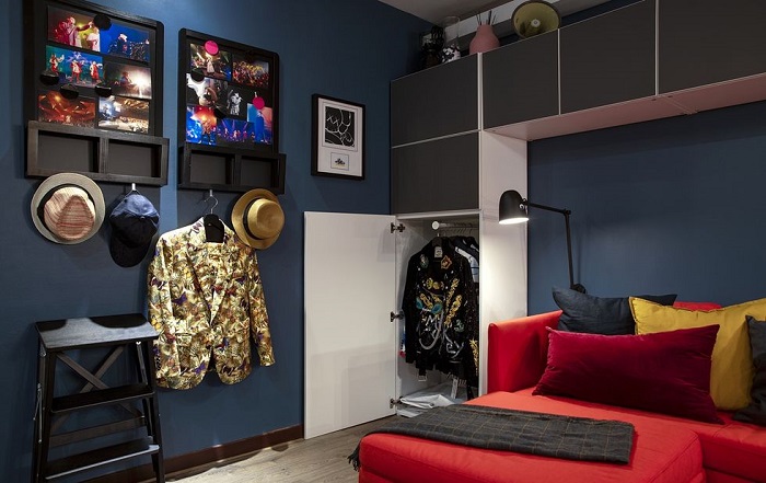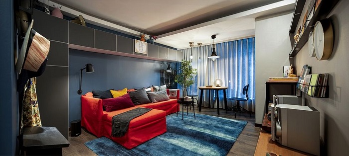 型男房邀请到身份横跨多领域的黄子佼操刀设计,选用大红色的转角沙发床成为空间亮点使用上也富有弹性,椅凳下还能有额外的收纳空间。此外也运用巧思让生活充满变化,墙面的展示架放置他喜爱的黑胶唱片,每天都可以面对自己喜爱的音乐收藏。