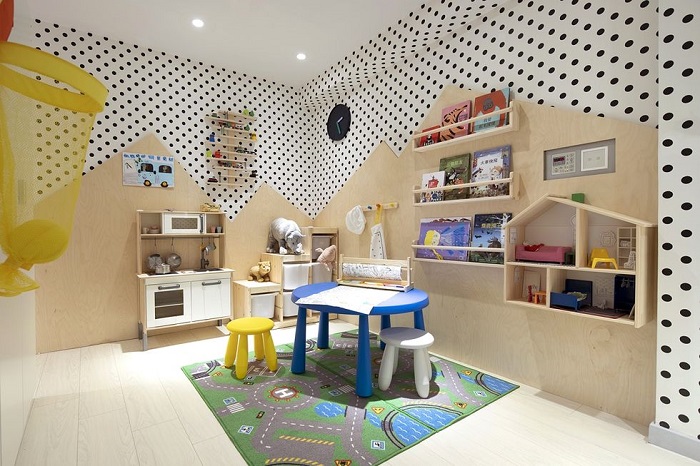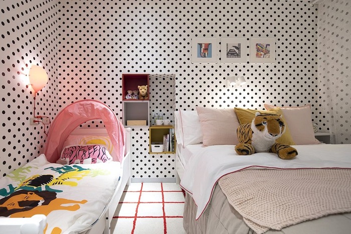 房间最里头是睡觉的空间,除了舒适的双人床,还有一张专为成长中孩子设计的延伸床,能随着身高调整长度,睡到180公分都没问题!IKEA认为儿童是全世界最重要的人,游戏与互动是亲子很重要的活动之一,所以一进门的独立区域规划了一个孩子的游戏空间,儿童的桌椅、玩具小厨房之外,还有足够的收纳柜。