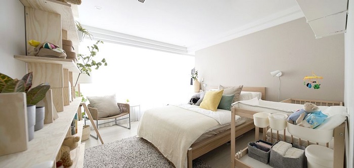 这间房邀请了新手妈妈魏如萱来进行规划,这里有婴儿床、尿布更换台、摺叠地垫打造实用的育儿空间。有着单椅与充满设计感立灯的舒适小角落,是魏如萱特别选的,既是放松的角落,也是半夜喂奶的好空间。