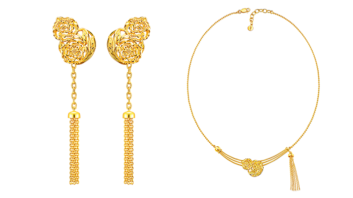 《金喜连连》系列中,也值得大家珍藏的,还包括了《福绿双全》系列首饰,一套以牡丹花构成的葫芦项链和耳环。牡丹花象征着富贵,而谐音为福禄的葫芦,更是在风水中被认为有辟邪挡煞的作用,所以《福禄双全》项链和耳环也意寓着为佩戴者安享荣华富贵。