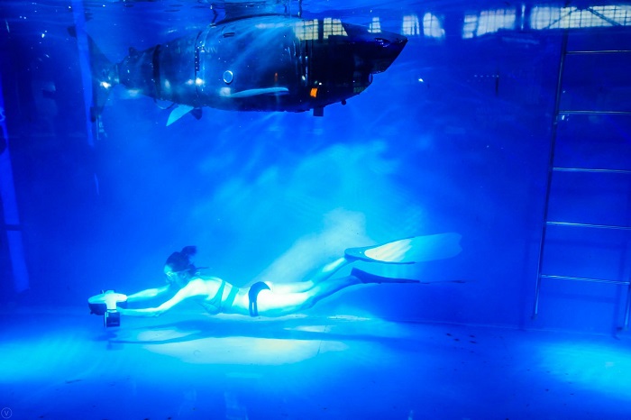 有没有想过你去一个地方,可以不是坐飞机,不是开车,而是骑着鲨鱼出行。智能仿生鲨鱼潜航器ROBO-SHARK可以用作海洋科考和海底管道检测等。在会场上,工作人员就展示了仿生鲨鱼试驾和水底航行器的体验。