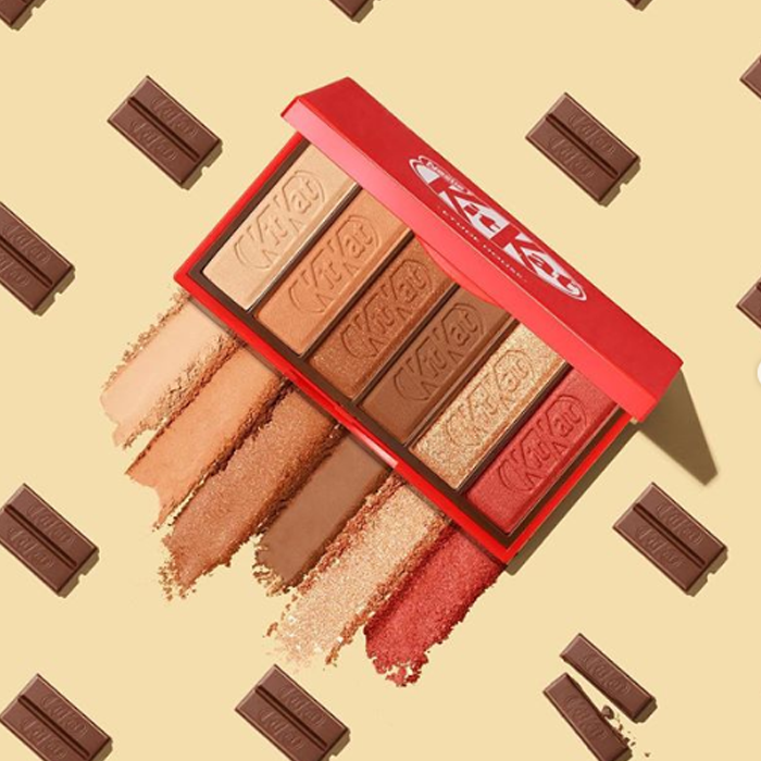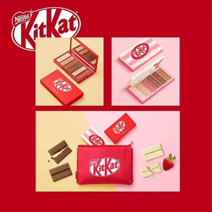购买这一组甜蜜眼影盘除了附送KitKat红色标志的化妆袋,还有原味KitKat和草莓Tiramisu巧克力一盒呢!一边化妆一边吃巧克力也太开心!