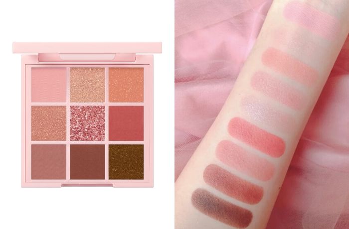 淡淡樱粉色的包装灵感来自樱花绽放放到飘落的九种色彩,9个配色内有4个哑光4个珠光1个大亮片。除了眼影还能延伸用在眼线和腮红上,实用度很广。