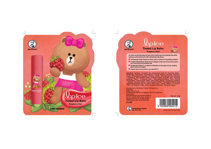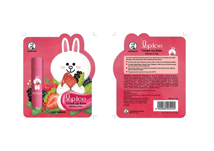 Mentholatum LipIce Tinted Lipbalm 著色润脣唇膏备有2种选择:Raspberry Red覆盆子红和Wild Berry Pink浆果粉红色调,分别是由Line Friends家族的 CHOCO和CONY成员作为代表。