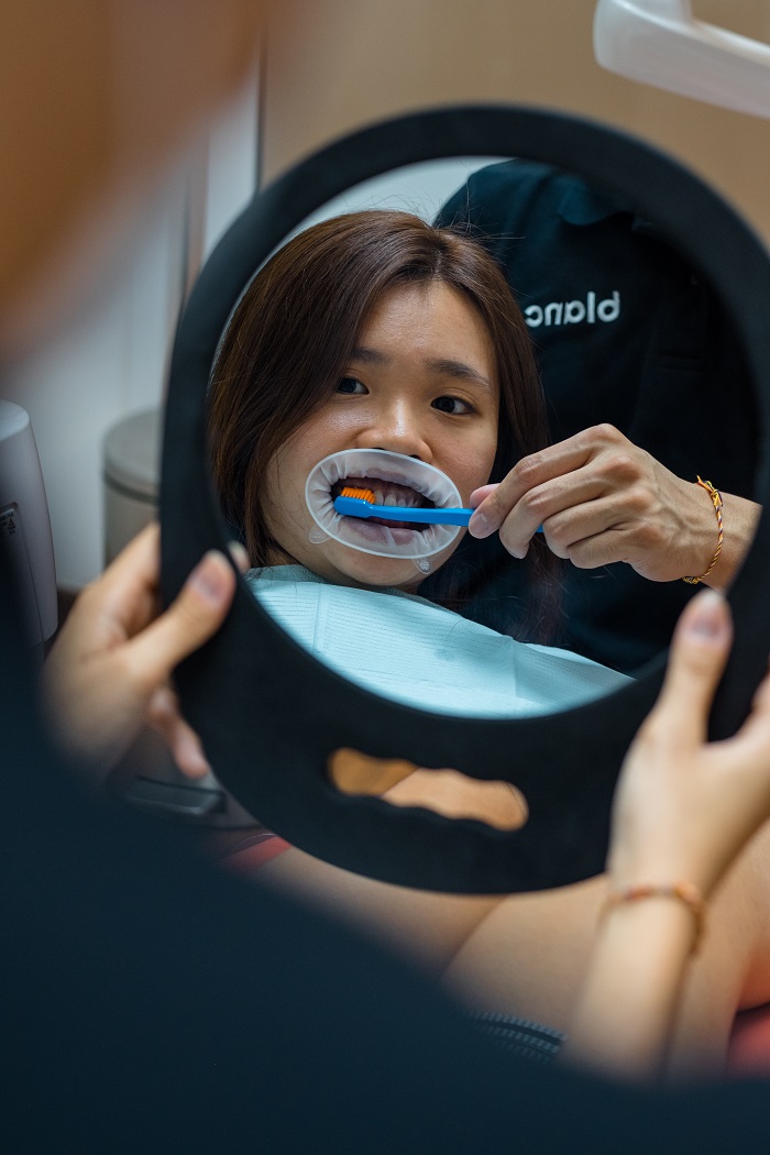 4:Dr Mike再透过为顾客量身定制的 Curaprox牙刷和刷牙技术来进行口腔卫生教育。