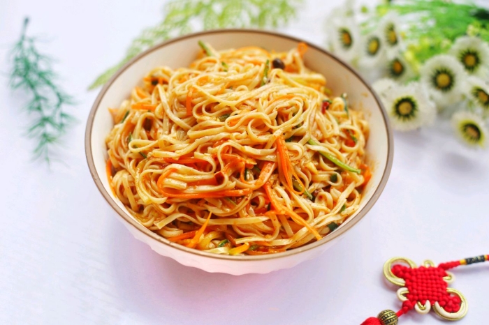 d)把泡面放到调好的酱料里,加上黄华寺、香菜、花生米,搅拌均匀即可享用!