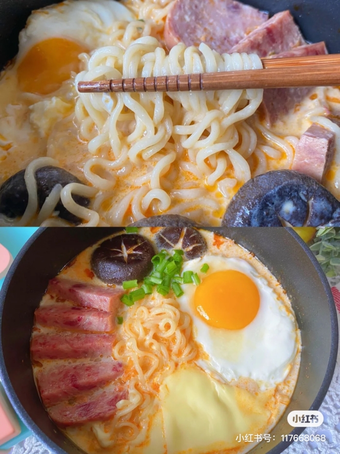 食材:1包泡面、芝士2片、鸡蛋1颗、牛奶半杯、香菇、火腿