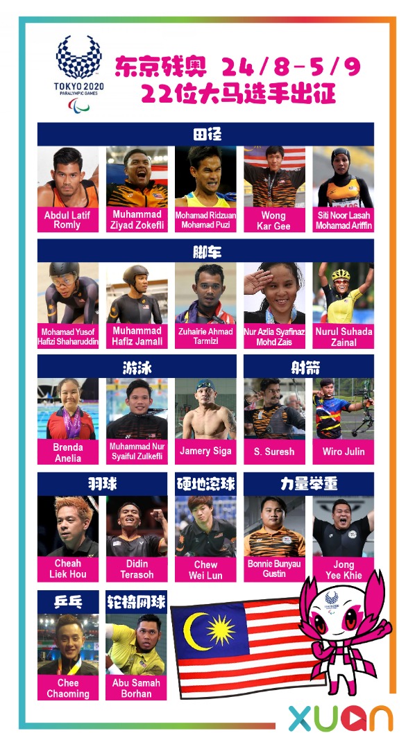 马来西亚代表团将有22位选手出赛,并会参与9个主要赛项,包括田径、游泳、脚车、羽球、乒乓、轮椅网球、硬地滚球、射箭以及力量举重!让我们一起期待大马健儿带来好消息吧!加油!