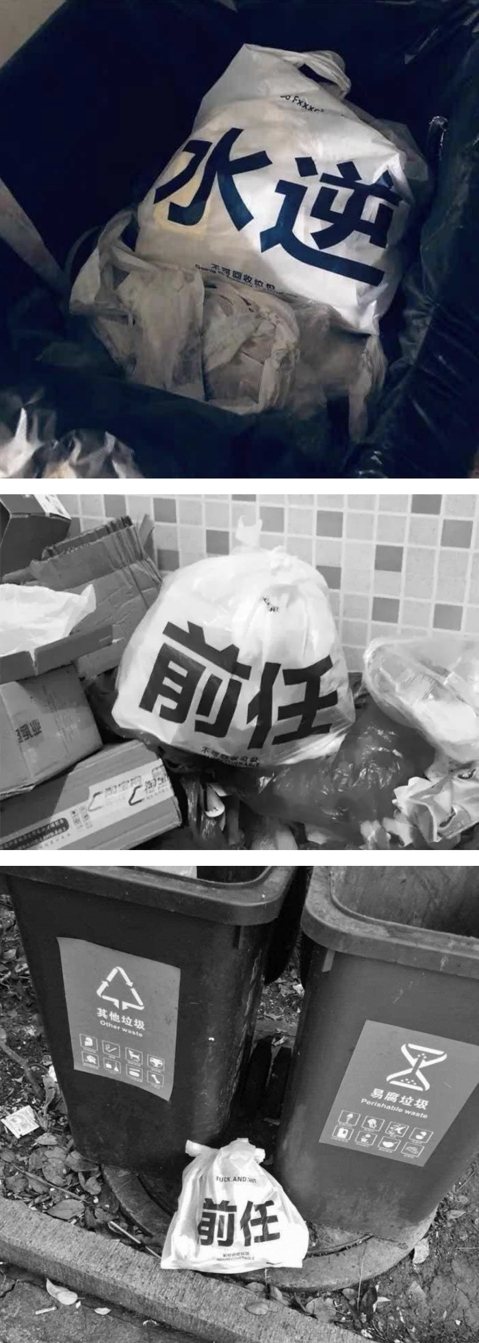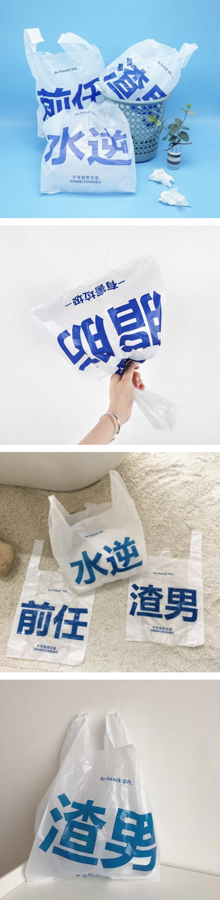 除了中央位置大大的字眼外,袋子上还印有一系列较小字体的文字,分别就写上了 Go Fxxxck Off…、Goodbye Ex、有害垃圾、不可回收垃圾 Nonrecoverable 等等,代表着丢掉的这一袋不仅是垃圾,更是永不相见的衰事!