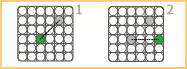 所有按钮处于未按下状态,从任意位置开始,向水平、垂直。对角线上隔1格或2格进行跳跃,尽可能按下更多的按钮(不能重复安同一个位置)。