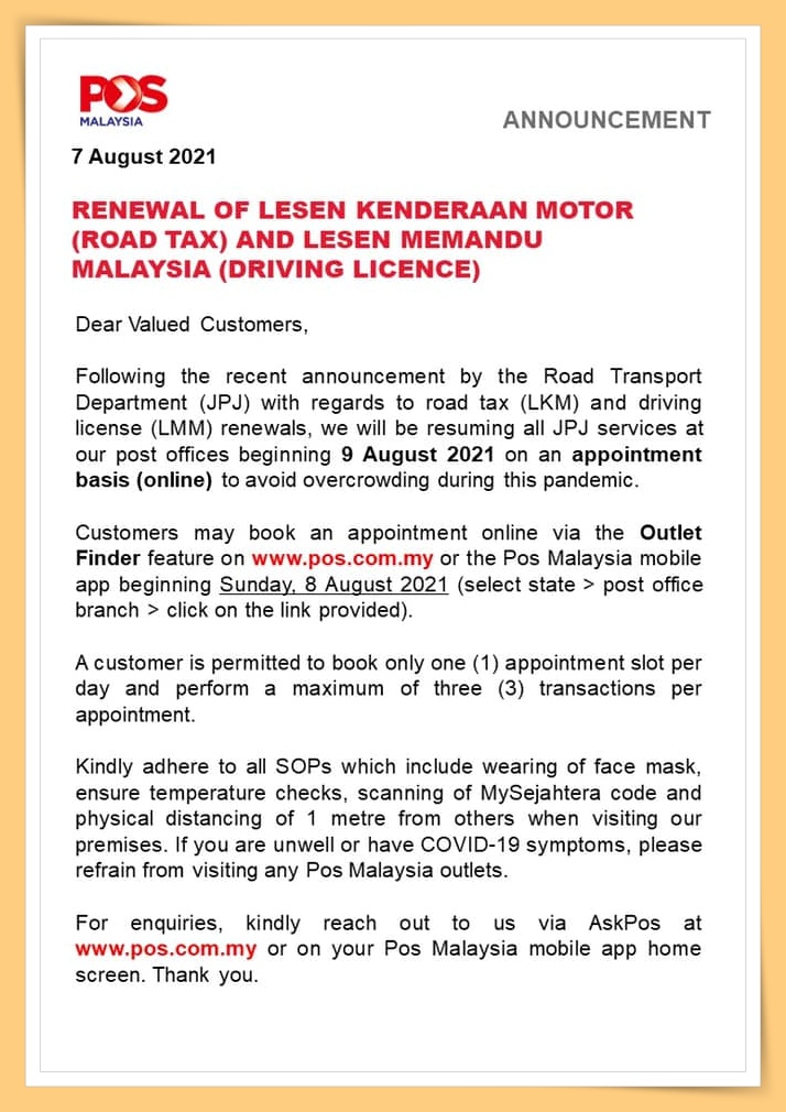 如果你想更新驾照或者路税,从明天起可以到邻近的邮政局更新。不过,POS Malaysia在脸书发文通知,若民众前往邮政局前必须先上网预约时间,主要是避免太多人到邮政局,导致人潮过多无法遵守SOP。