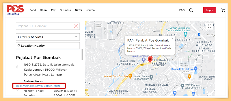 步骤1:首先浏览:https://www.pos.com.my/pos-outlet-finder/,在搜索栏中输入你要去的邮政局分行