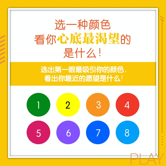 最近觉得人生很迷茫吗?但无法诉说自己心中到底想要些什么,如果是这样的话,就用个小测试来看出你最近的愿望是什么吧!依据自己第一直觉,在图片中选出一个颜色,答案就在下方哦!