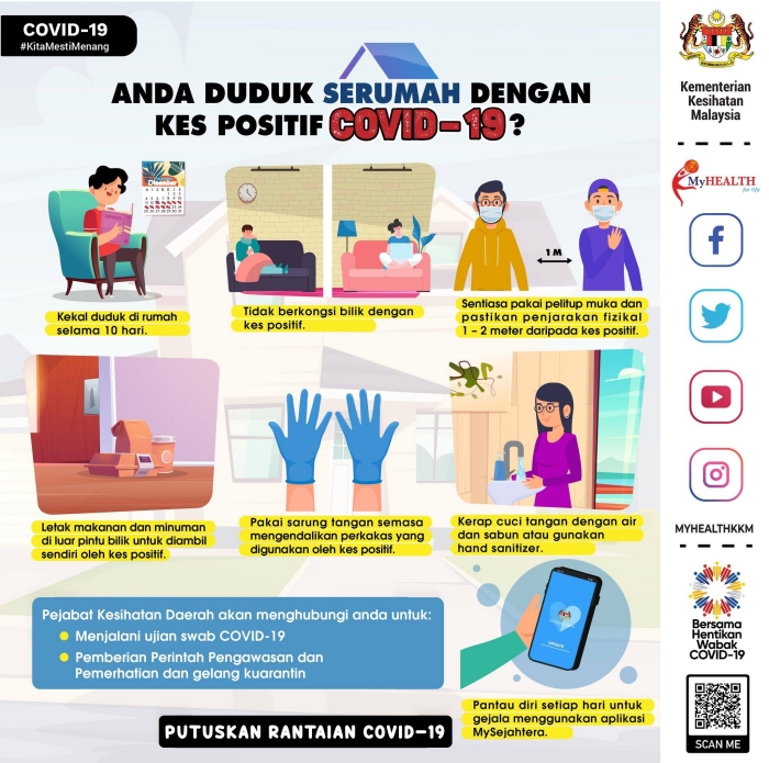 大马新冠病毒确诊数字飙升,如果不幸身边的人确诊,而因为病患只有轻微症状,被安排在家中隔离,那同住在一间屋子下的我们该如何防疫?日前卫生部就发布了这一张居家隔离防疫指南图供大家参考,大家不妨来看看!