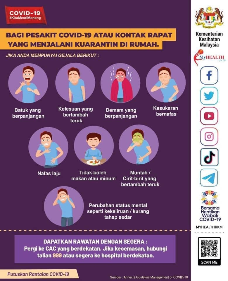 卫生部也提醒居家隔离的人士,特别是确诊者务必自我监督健康状况,一旦出现“警示症状”(Warning Sungs),必须立刻到附近的医疗中心求医。