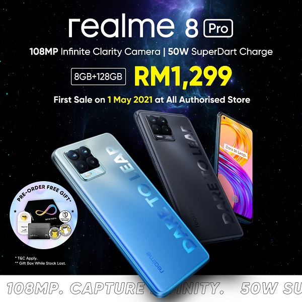 realme 8 Pro的售价为RM1299,8GB + 128GB版本,分别有 Infinite Blue 和Infinite Black。预购活动从即日起至4月30日,预购将送出 realme 独家礼盒和2年保修。5月1日在realme Brands Store 及 realme 授权经销商处正式开卖!