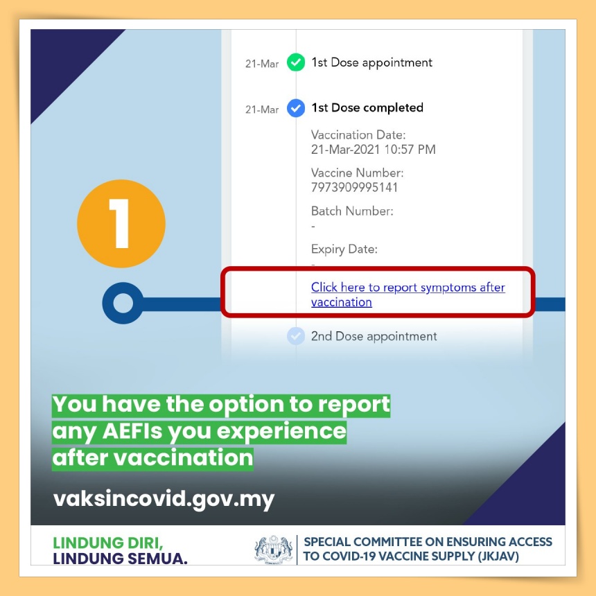 如果你接种疫苗后有出现症状,可以透过MySejahtera App去汇报。