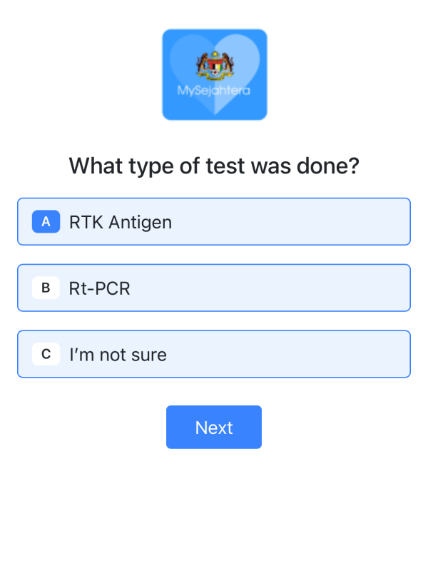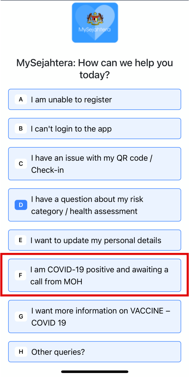 步骤3 点击选项F(I am COVID-19 positive and awaiting a call from MOH)
