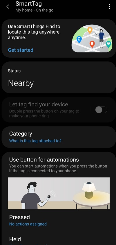 除了可以找回遗失的物品,Galaxy SmartTag还可以和家庭周围的IoT设备进行通信,如果你的SmartThings应用程序里支持空调或照明灯,则可以使用标签上的按钮打开或关闭哦!