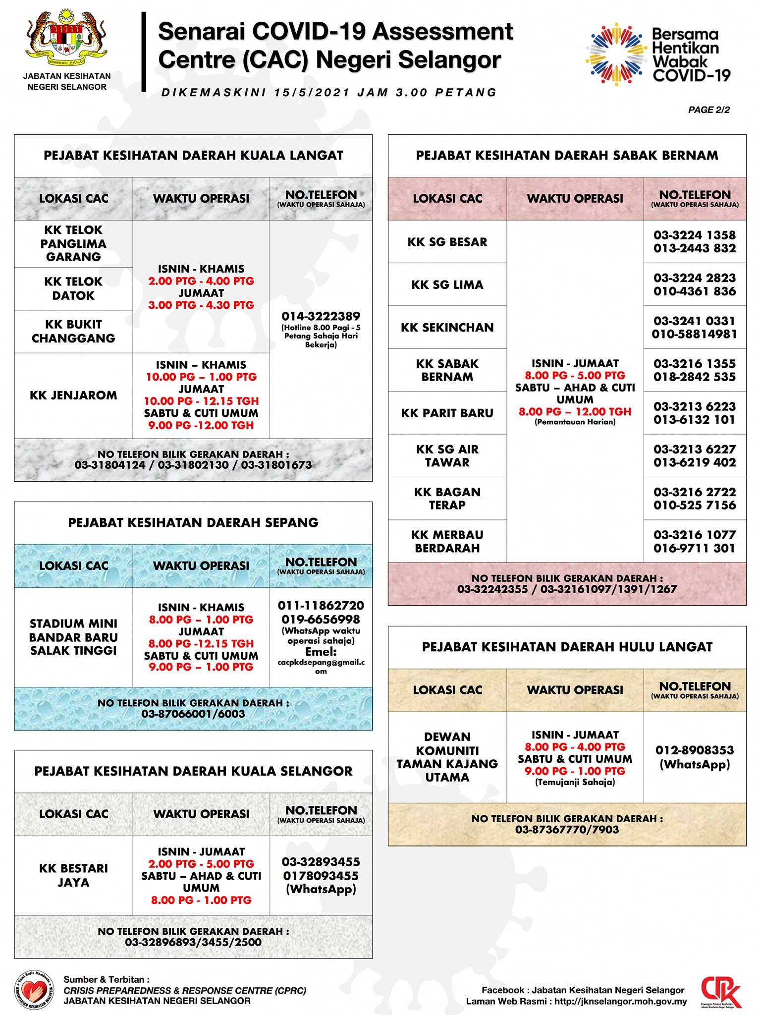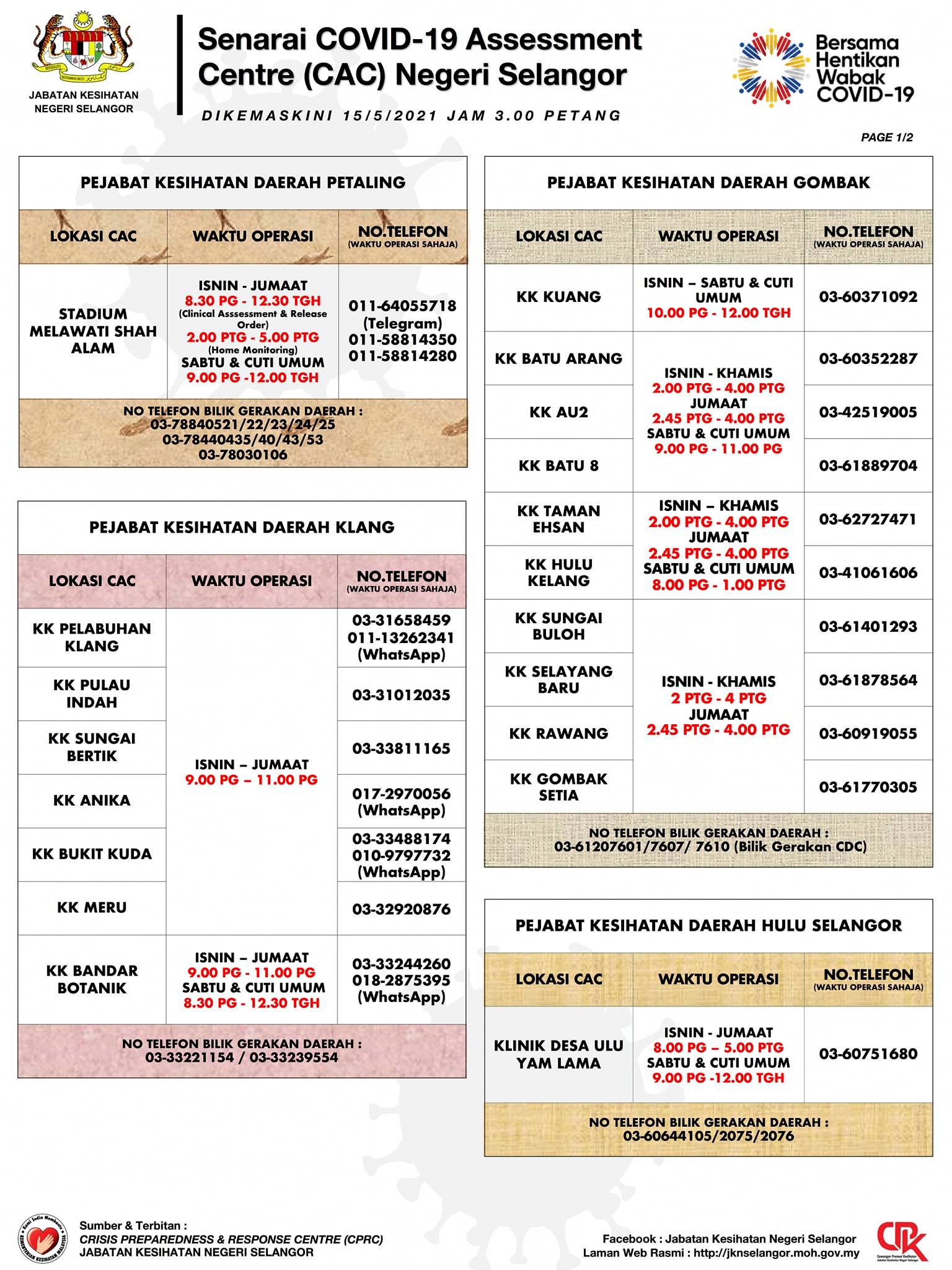 之前,Jabatan Kesihatan Negeri Selangor发布了雪州各县的COVID-19评估中心,如果你或或家人染上冠病可以联系他们。