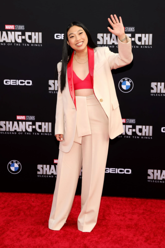 ⬇️ 女主角Awkwafina穿上了一袭日式和服为灵感设计的西装套装,搭配利落的bralette,展现出美国女星的飒爽啊~所以说她也不是来比美,是来和男主角刘思慕比帅吧?