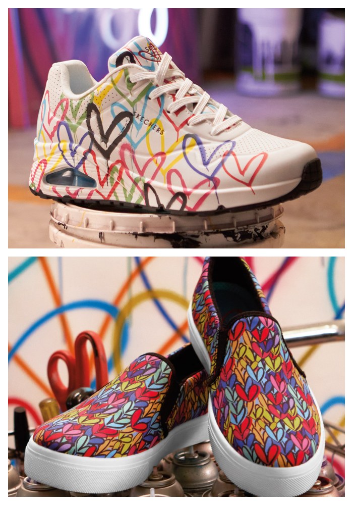 联名绝对适合艺术家最靠近的机会!Skechers还牵手了国际艺术家James Goldcrown打造爱心联名鞋款。擅长用涂鸦方式展现各种爱心,而且配色缤纷亮眼,真的很打动女生们的心!