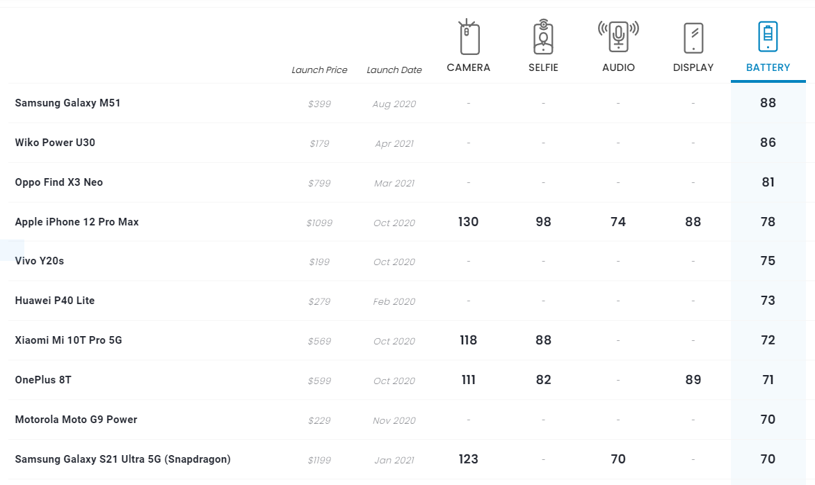 DXOMARK向来以智慧型手机相机测试闻名,如今也推出全新的电池基准测试,结果在榜单中有iPhone 12 Pro Max的踪影,而且还排在第4位。