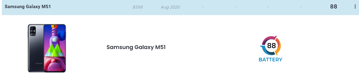 ⭕第一,Samsung Galaxy M51,电池评分88,电池容量7000mAh