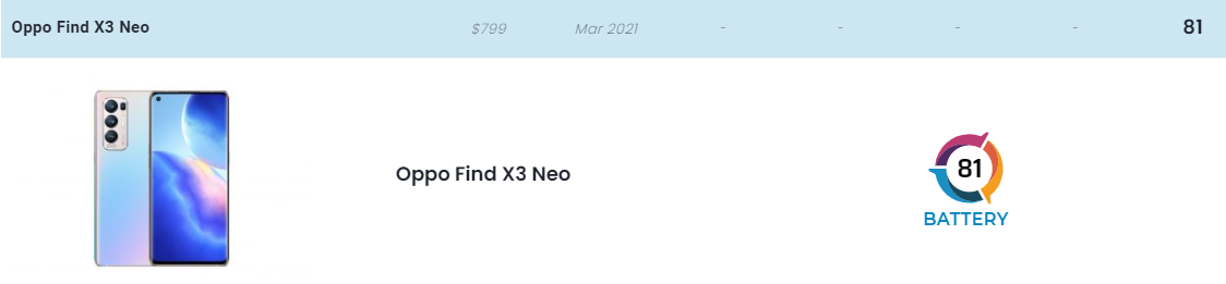 ⭕第3,OPPO Find X3 Neo,电池评分81,电池容量4500mAh