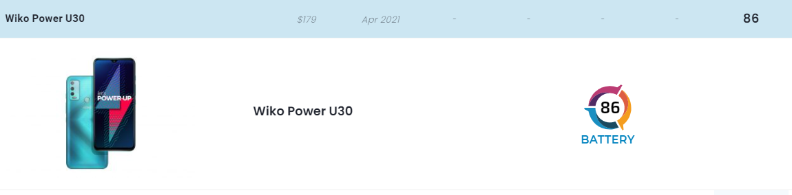 ⭕第2,Wiko Power U30,电池评分86,电池容量6000mAh