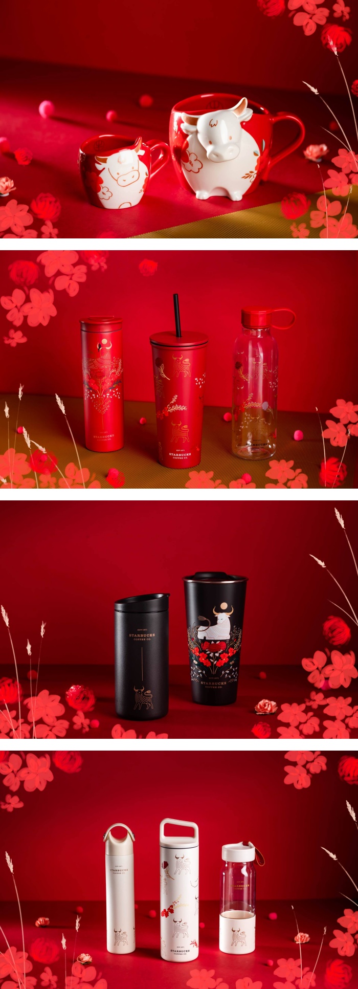 马来西亚和新加坡星巴克推出了3种不同色系的牛年系列产品,当中就包括了喜庆洋洋的红色、充满气质感的暖白色以及弥漫神秘质感的黑色,所有产品上都印上符合牛年的图腾,加上红色鲜花的细节点缀,每一款都非常精致好看啊!